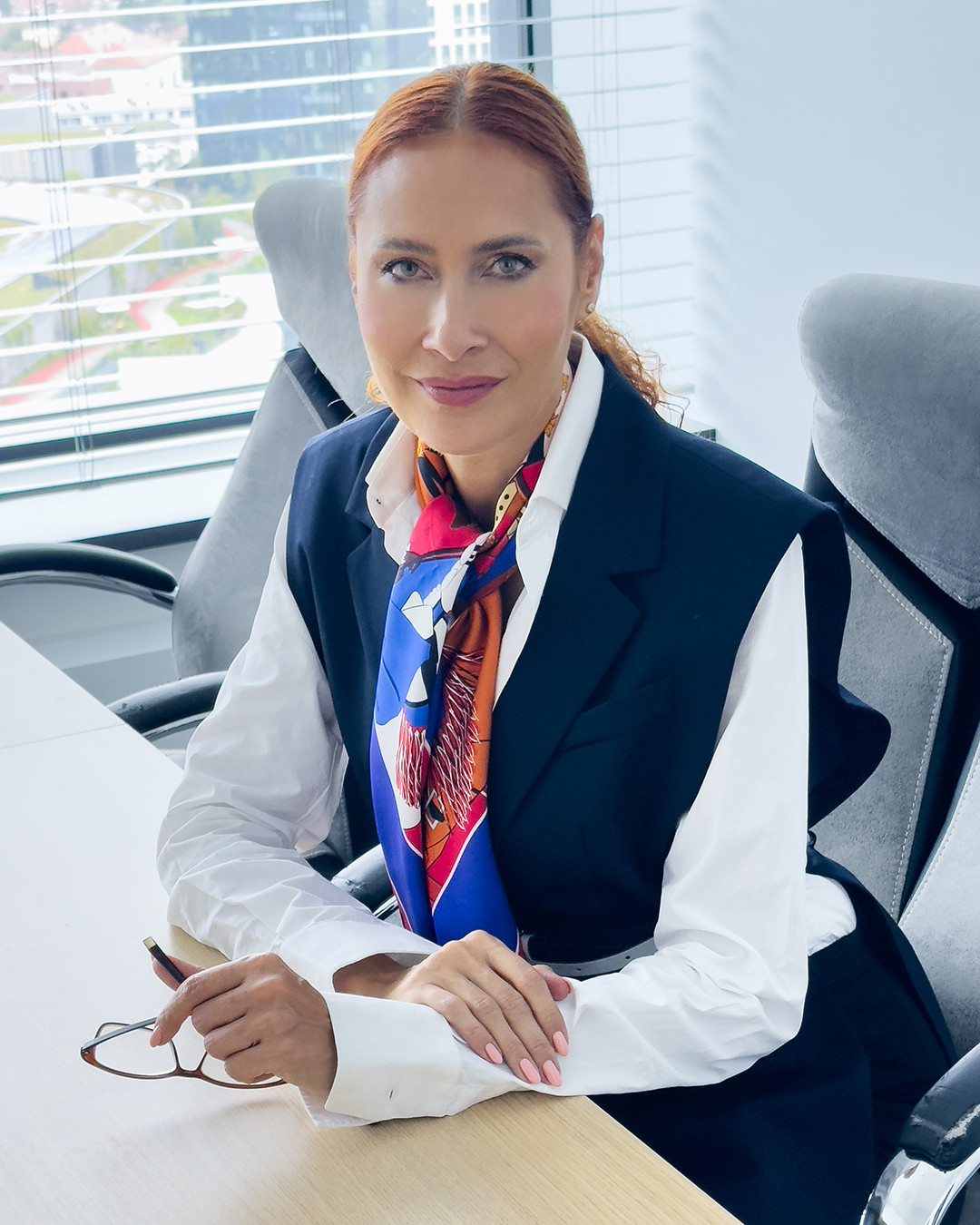 Equestrian chic – Elegantne uviazaná okolo krku k bielej košeli a džínsom s hnedými koženými jazdeckými čižmami.