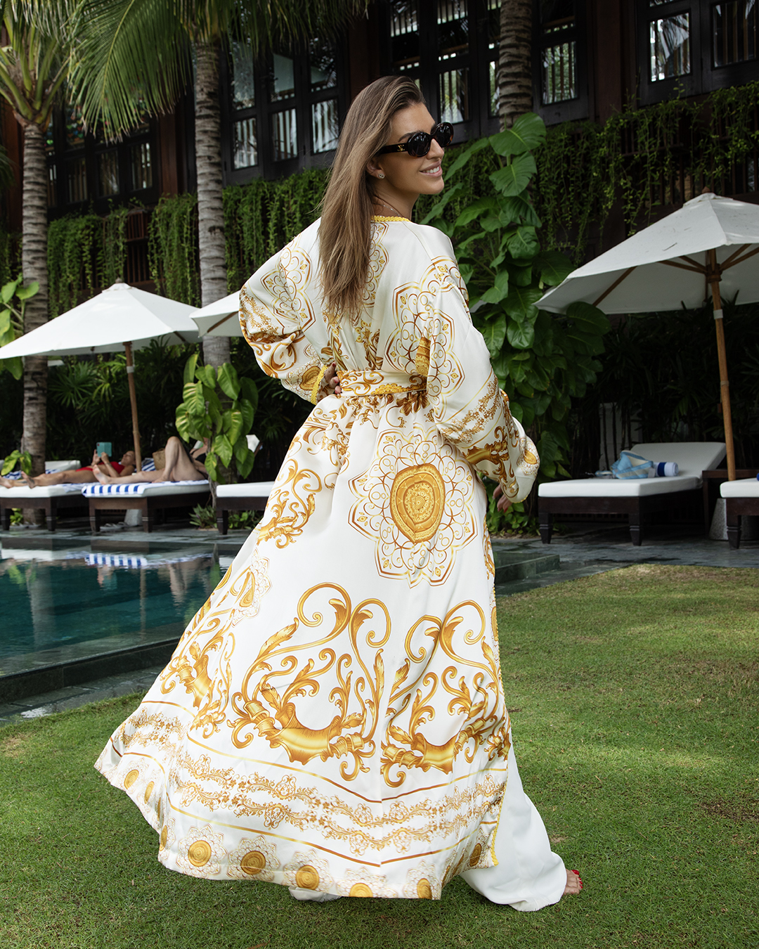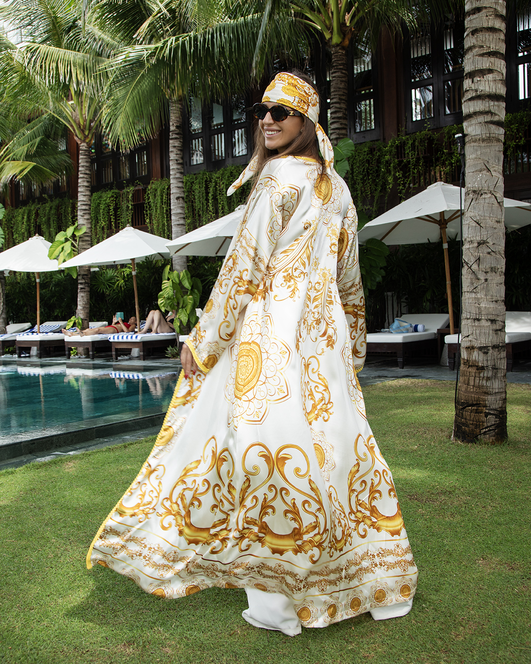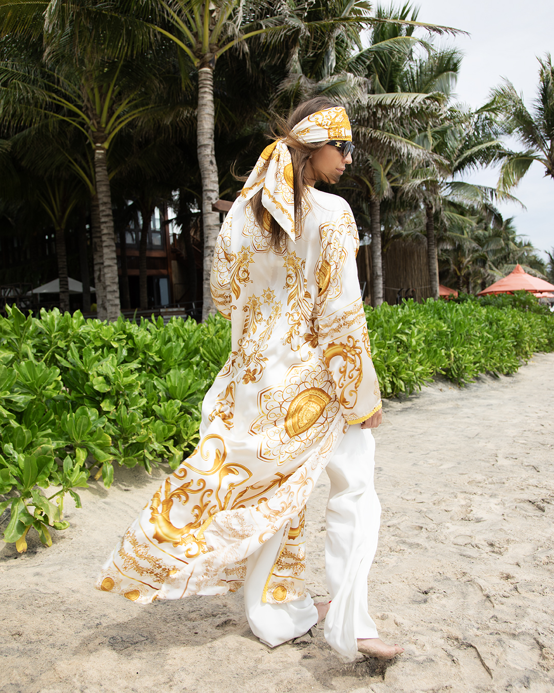 Poznámka: Tento výnimočný župan je súčasťou našej exkluzívnej limitovanej kolekcie. Pre dokonalý look odporúčame kombinovať s hodvábnou šatkou v rovnakom dizajne, ktorá je k dispozícii v našom e-shope.